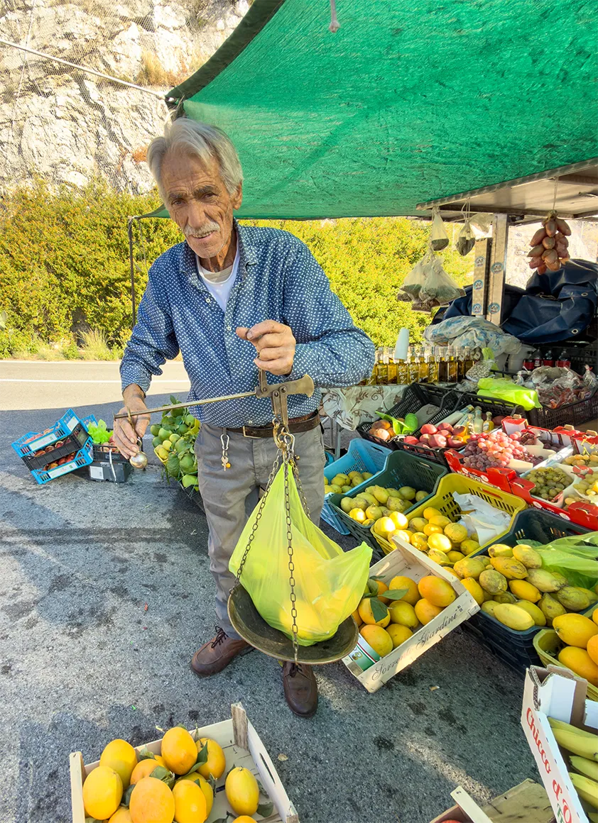 Immer wieder entdecken wir kleine Obststände am Straßenrand – richtige Klischee-Kulissen mit Granatäpfeln, getrocknetem Chili und Zitronen, die aussehen, als hätten sie Bodybuilding gemacht. Bei einem Stand – samt urigem Besitzer und antiker Balkenwaage – werde ich schwach. Zwei riesige Zitronen wandern in unsere Einkaufstüte, dazu eine Orange und noch eine Zitrone für den Notfall. Der Verkäufer wiegt alles mit einer Ernsthaftigkeit, als handle es sich um Goldbarren. Stefan grinst, ich halte meine Beute stolz wie ein Schatz in den Händen.