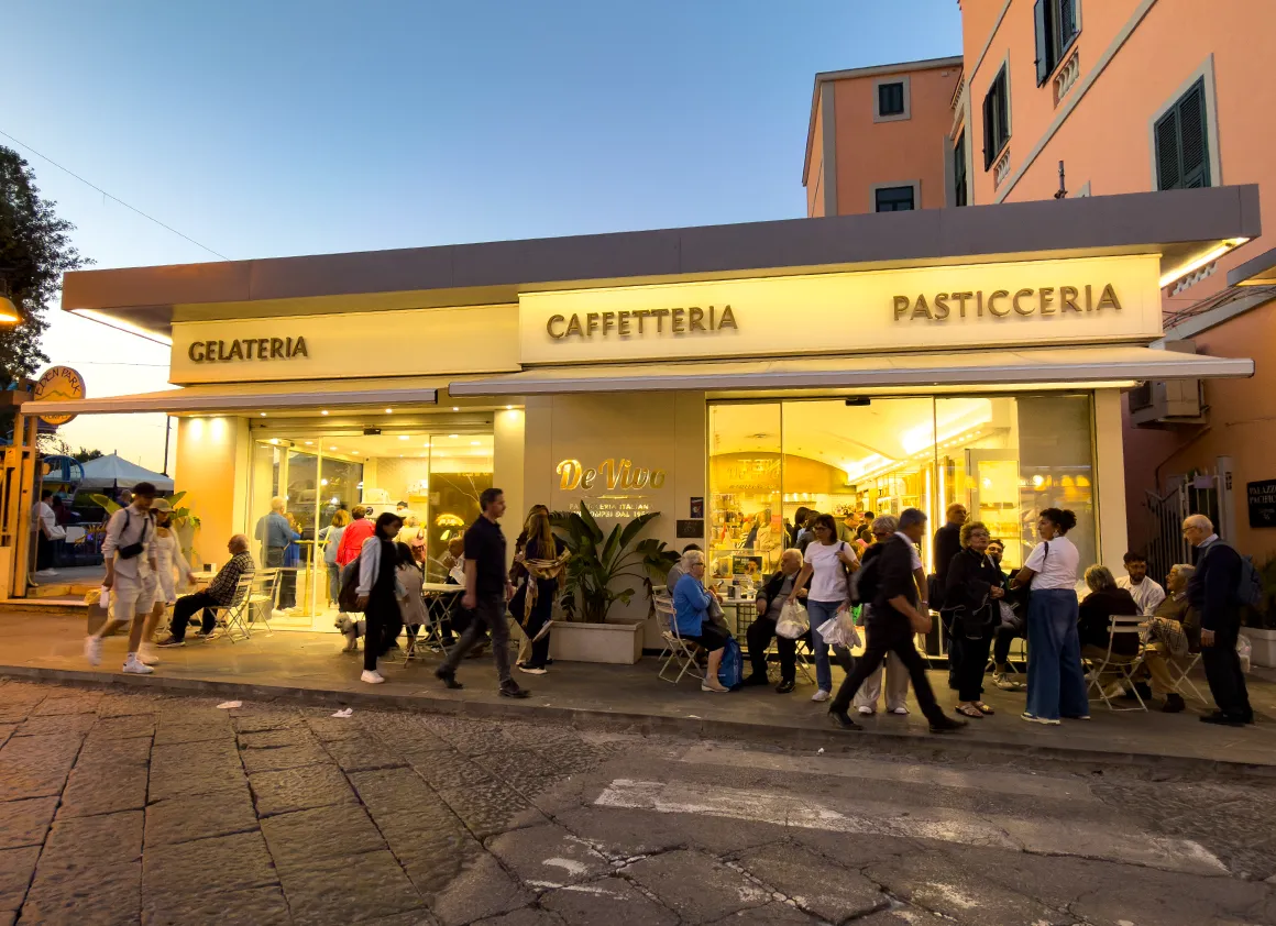 Auf dem Weg zurück zum Auto führt uns unser Weg vorbei an einem Laden, der uns schon zuvor aufgefallen ist – und jetzt scheint ganz Pompeii dort Schlange zu stehen. Die Caffetteria-Gelateria-Pasticceria De Vivo ist weniger ein Café als ein Tempel der süßen Sünden. Drinnen türmen sich die Dolci, dass es einem die Sprache verschlägt, draußen schlecken Groß und Klein ihr Eis mit ehrfürchtiger Hingabe. Natürlich können auch wir nicht widerstehen. Ich entscheide mich für ein cremiges Pistaziengelato, Stefan nimmt Zitrone – beide so gut, dass wir kurz vergessen, dass wir eigentlich schon pappsatt sind.