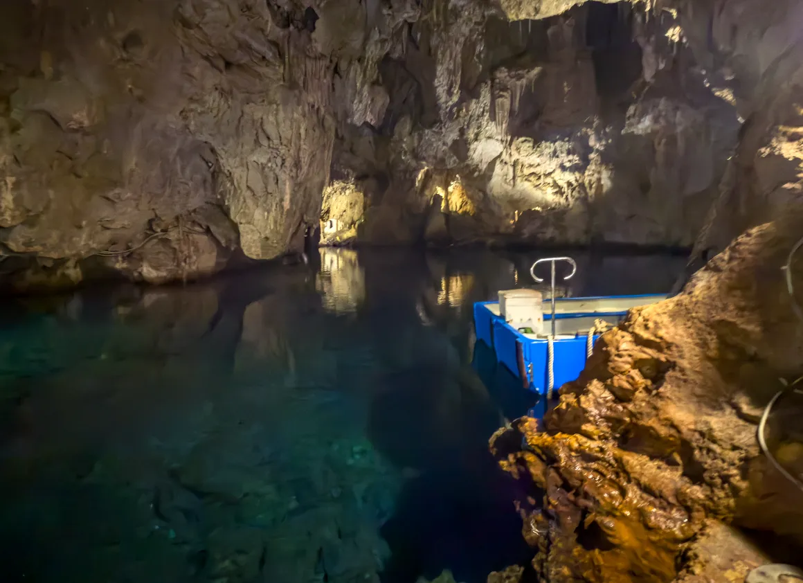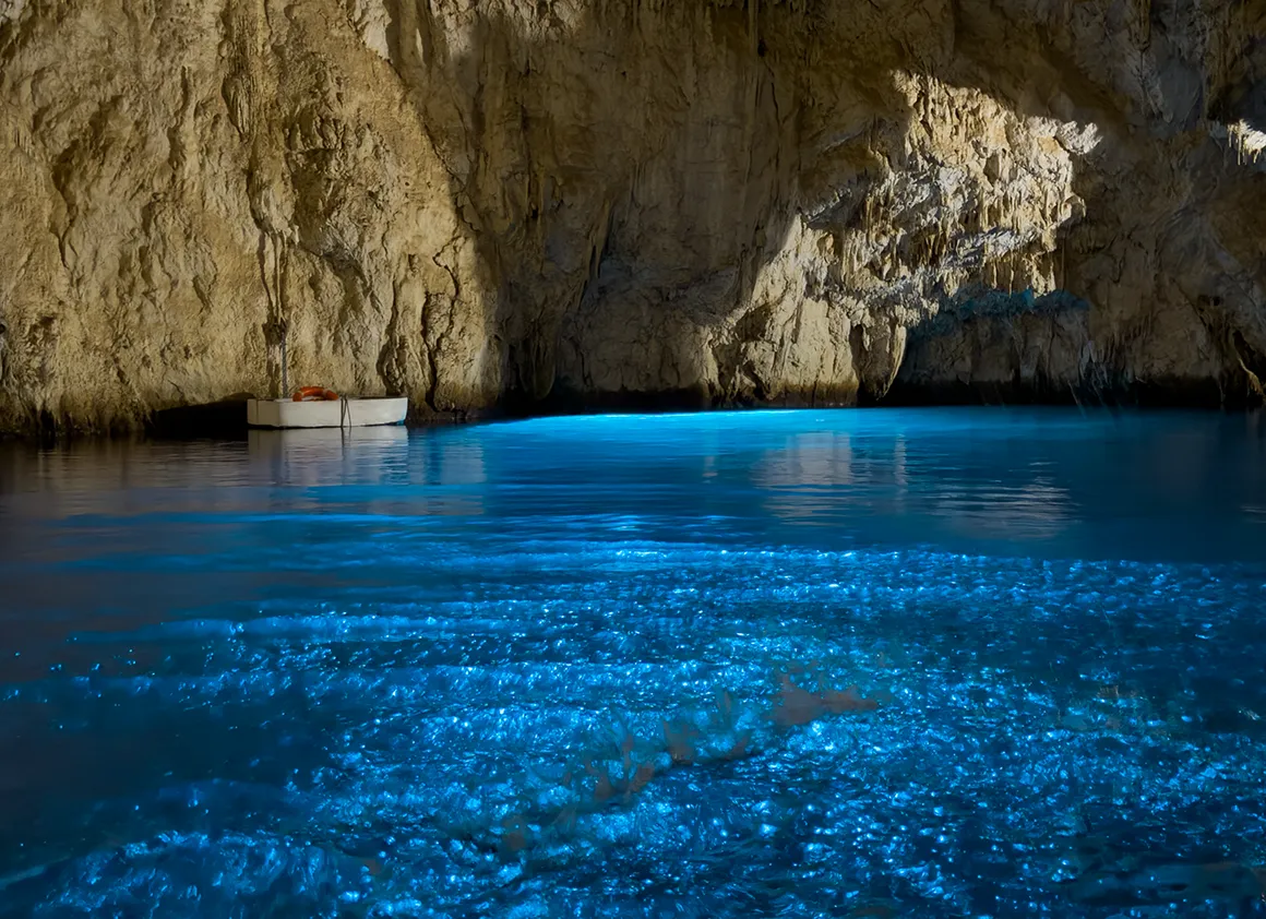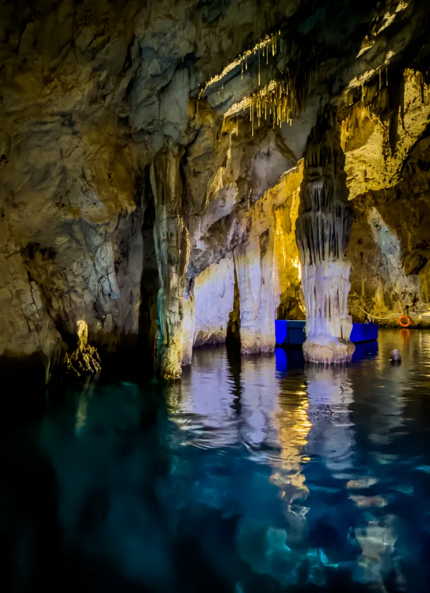 Die ersten Meter sind unscheinbar, fast dunkel. Doch dann öffnet sich der Blick auf einen unterirdischen, unwirklich leuchtenden See – in sattem Türkis, Blau, Smaragdgrün. Das Licht, so erklärt uns der wunderbar gut gelaunte Bootsmann auf Englisch, dringt durch eine unterseeische Öffnung in den Fels. Zehn Kilometer entfernt, irgendwo da draußen, ist das andere Ende – und hier, in der Grotte, verwandelt es sich in pure Magie.