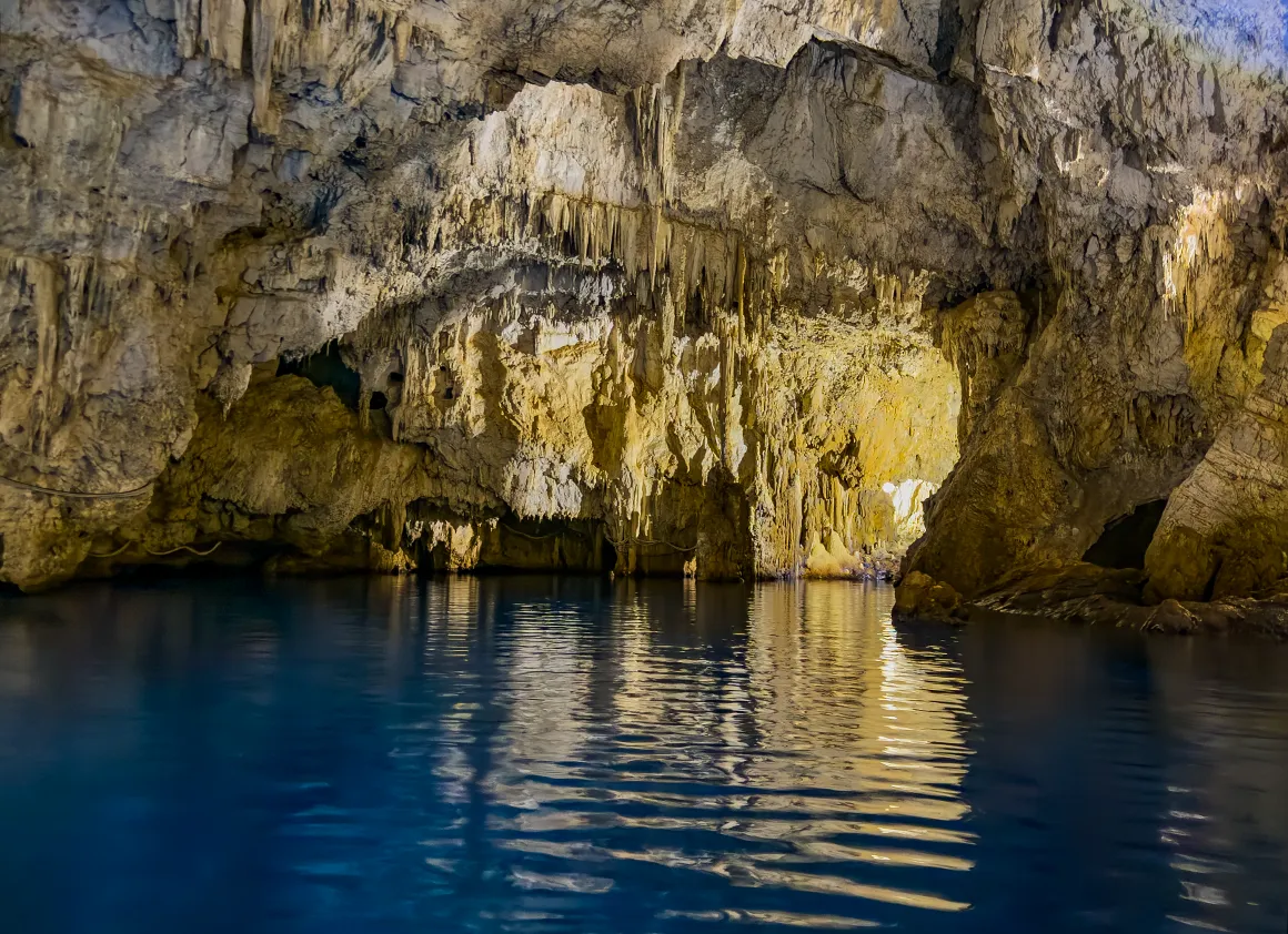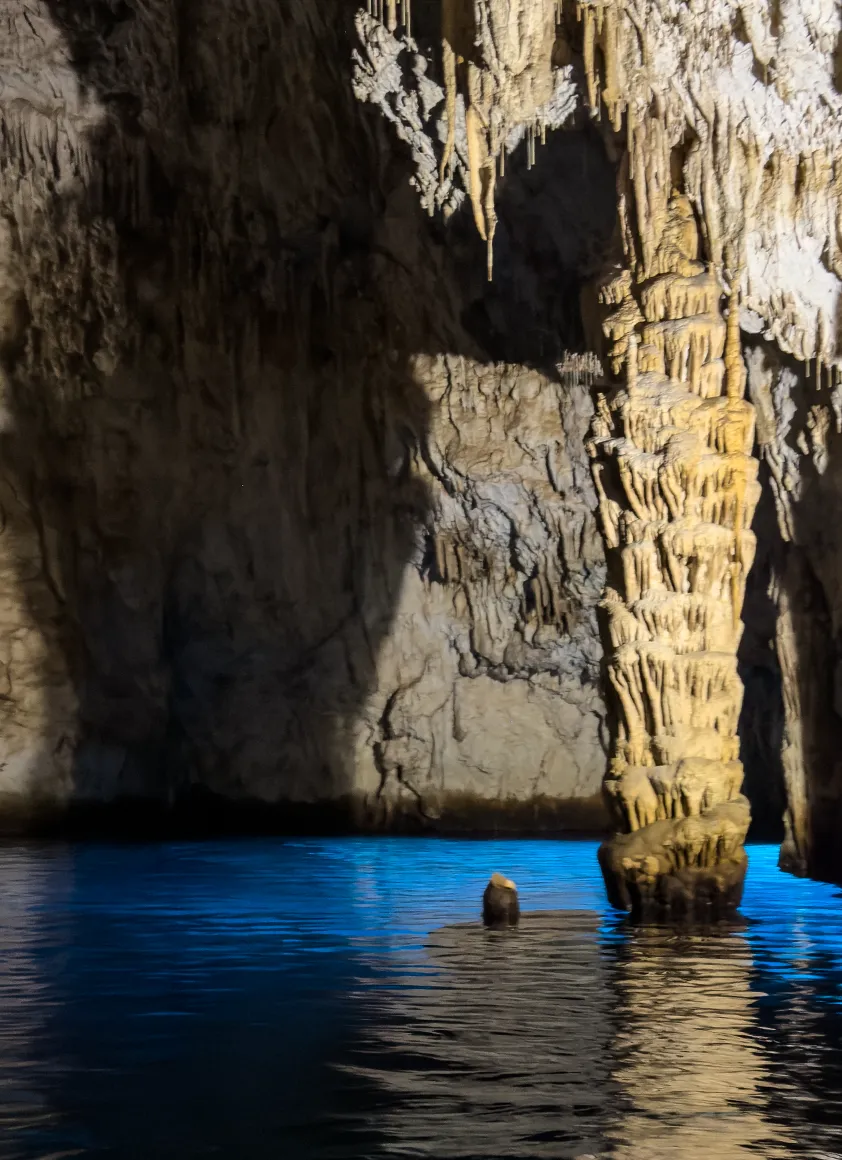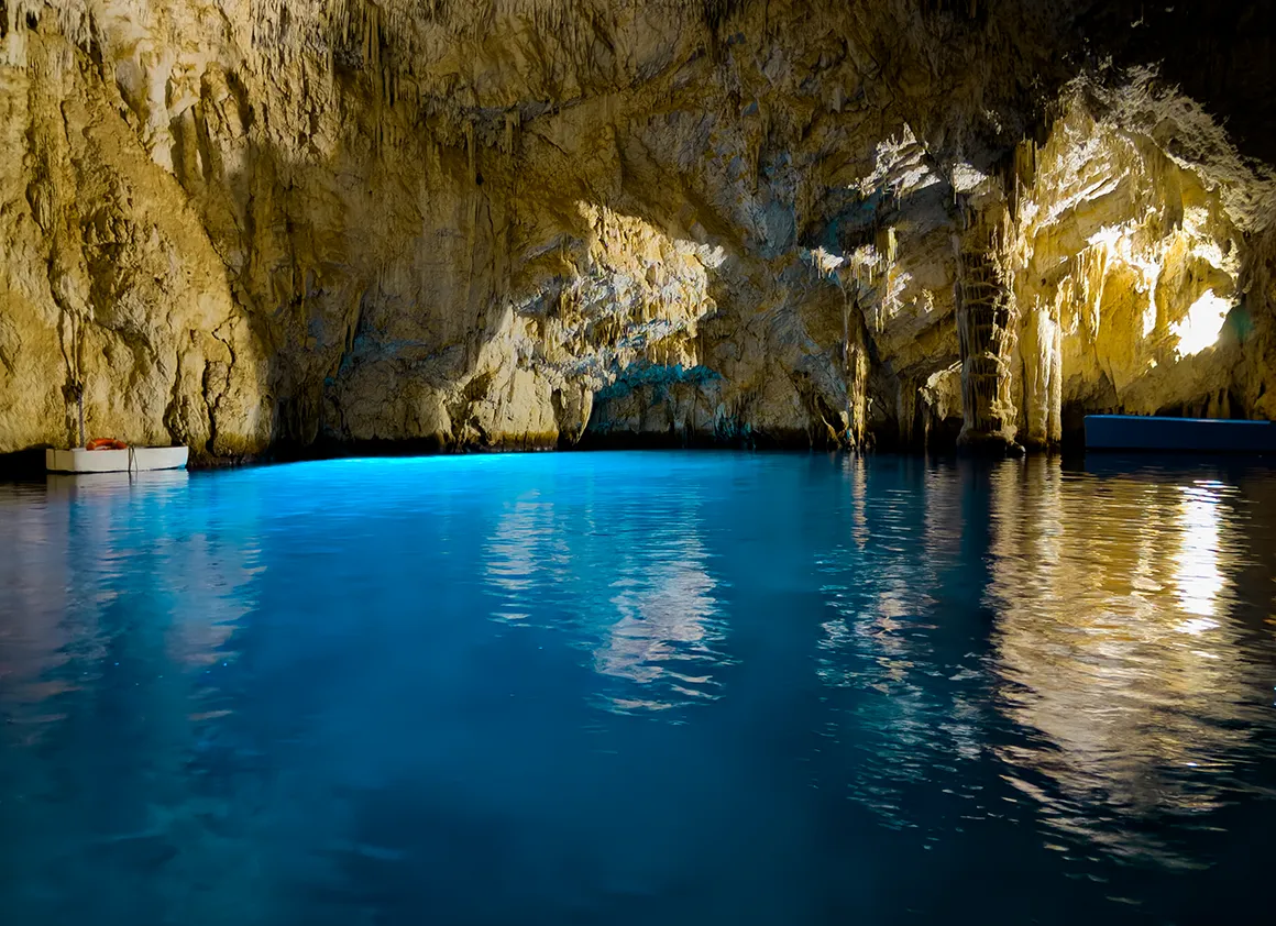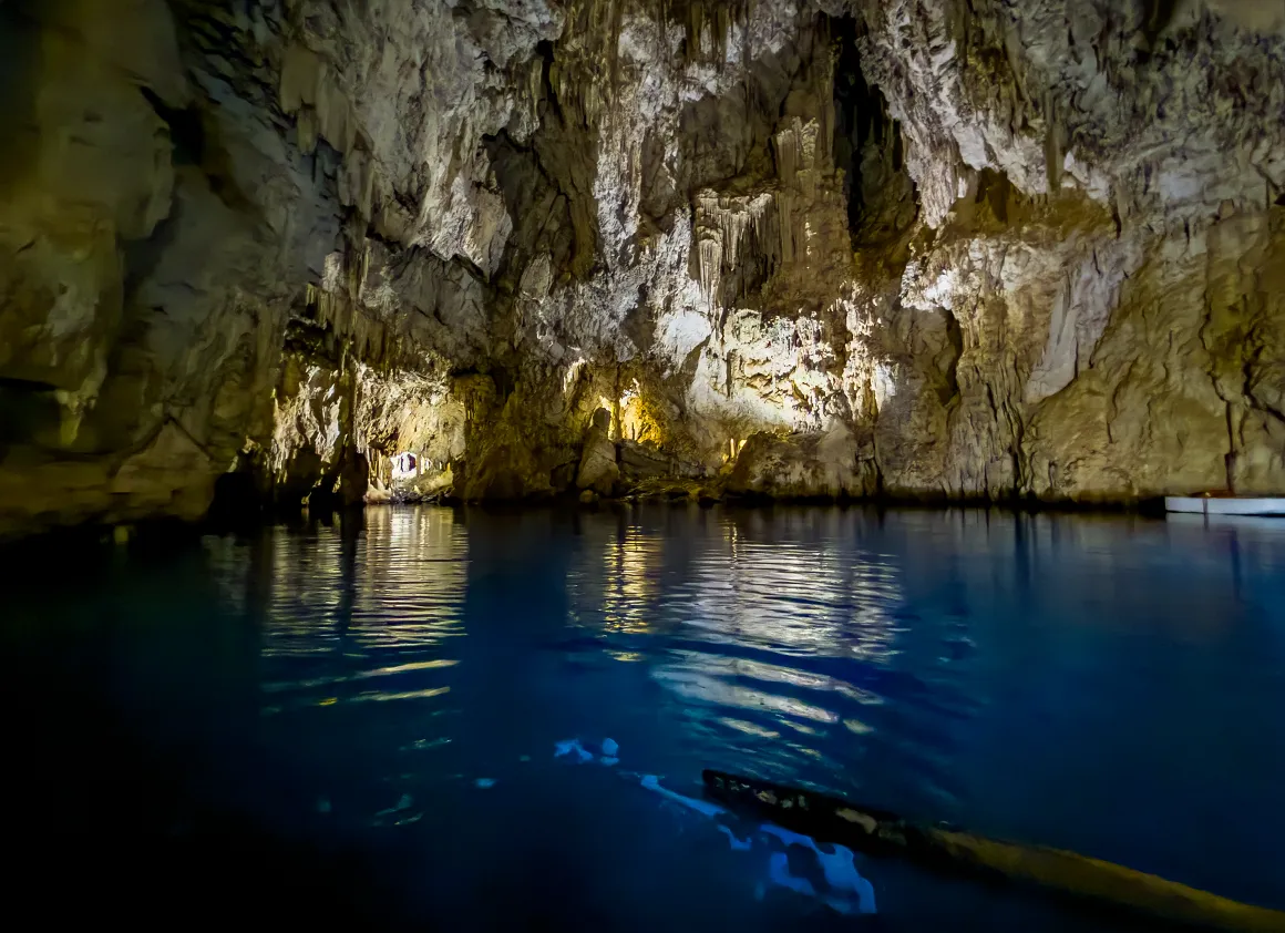 Die ersten Meter sind unscheinbar, fast dunkel. Doch dann öffnet sich der Blick auf einen unterirdischen, unwirklich leuchtenden See – in sattem Türkis, Blau, Smaragdgrün. Das Licht, so erklärt uns der wunderbar gut gelaunte Bootsmann auf Englisch, dringt durch eine unterseeische Öffnung in den Fels. Zehn Kilometer entfernt, irgendwo da draußen, ist das andere Ende – und hier, in der Grotte, verwandelt es sich in pure Magie.