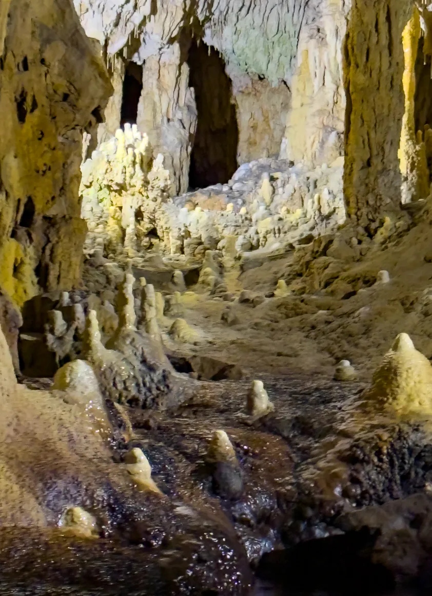 Wir gleiten lautlos durch das Wasser, das glitzert wie flüssiger Edelstein. An den Höhlenwänden hängen bizarre Tropfsteinformationen, die im Scheinwerferlicht wie Bühnenkulissen wirken – mal ein versteinerter Vorhang, mal ein steinernes Gespenst. Unser Guide deutet auf Gesteinsformationen, die er mit einem schelmischen Grinsen als „Schildkröte“, „Meerjungfrau“ oder „schlafenden Hund“ bezeichnet. Seine Witze sind so charmant wie seine Erklärungen – und seine Begeisterung wirkt ansteckend.