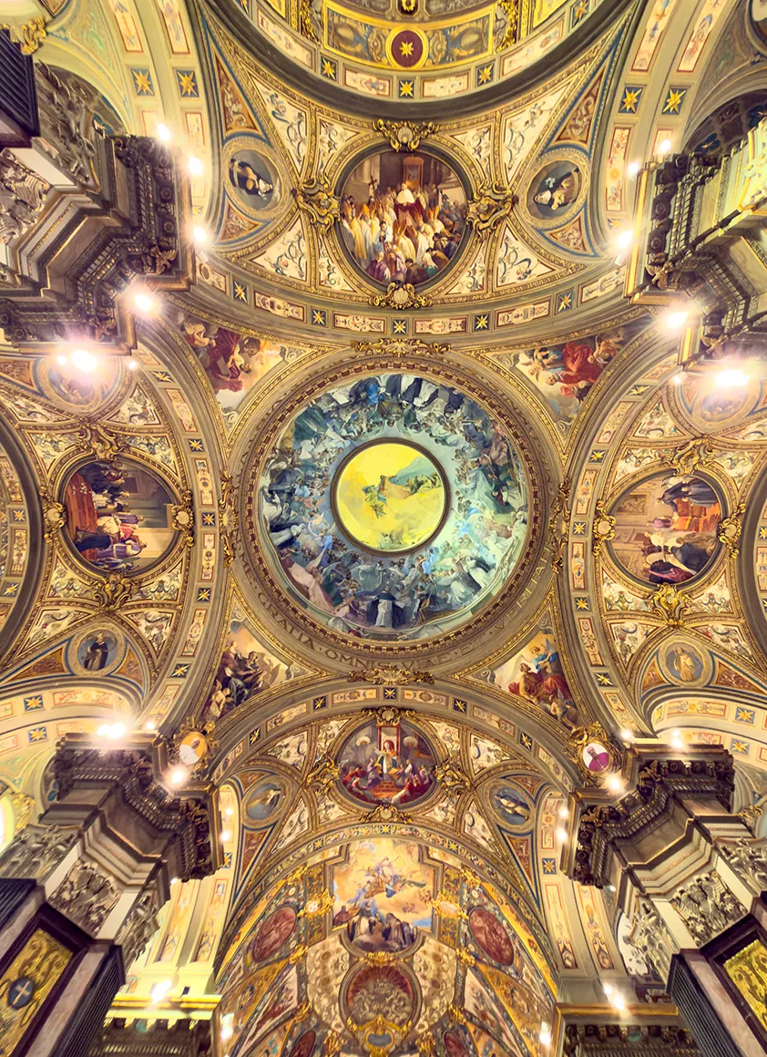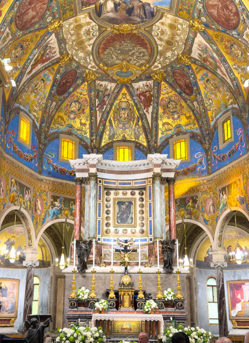 In Pompeji angekommen, steuern wir einen Parkplatz direkt an der Straße an. Dank der EasyPark-App sind wir in Rekordzeit startklar – keine nervige Kleingeldsuche, kein Parkscheinchaos. Einfach Zeit einstellen, fertig. Und dann machen wir das, was man nach einem solchen Tag einfach tun muss: langsam schlendern. Vorbei an Straßen mit Patina, durch Gassen mit Geschichte, bis wir vor der Santuario della Beata Vergine del Rosario di Pompei stehen. Außen neoklassizistisch mit mächtigen Säulen und strahlend weißem Putz, innen eine Überraschung aus Glanz und Gloria. Goldene Ornamente, leuchtende Deckengemälde und ein riesiger Kronleuchter, der an eine Opernkulisse erinnert – vielleicht nicht Phantom der Oper, aber zumindest Der Pate in der Hochzeitssequenz.