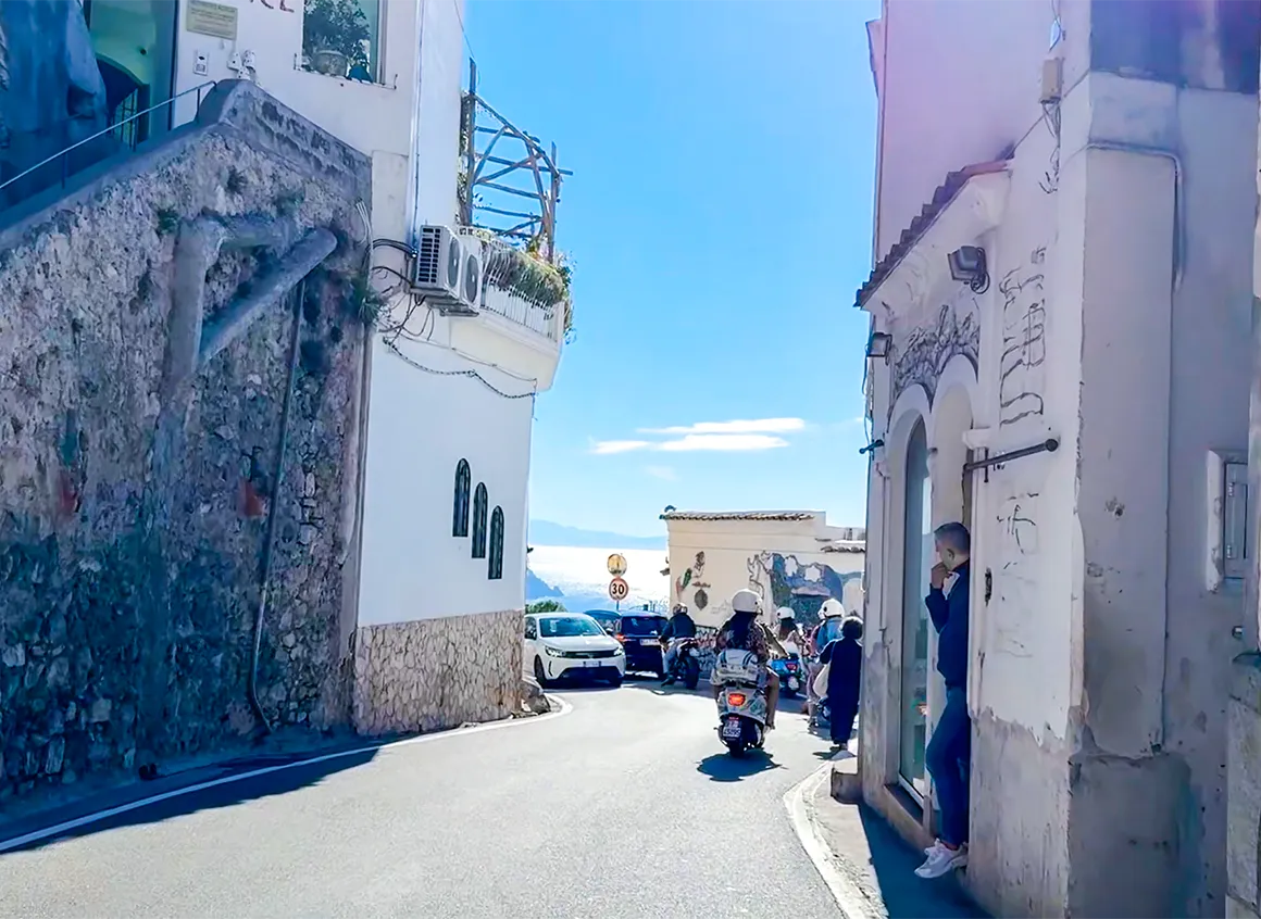 Dann geht’s weiter, der Straße entlang, immer tiefer hinein in die Welt der Terrassen, Mauern und dramatisch schmalen Ausweichbuchten. In der Ferne taucht Positano auf – wie ein Gemälde aus pastellfarbenen Häuschen, die sich verzweifelt an den Hang klammern. Wir fahren durch, einmal durch die Innenstadt – und genau das machen wir auch. Rein ins Getümmel, durch schmale Gassen, vorbei an Souvenirständen, die zum Greifen nah sind. Hätte ich den Arm aus dem Fenster gestreckt, ich hätte ein Tuch mit Zitronenmotiv stibitzen können.