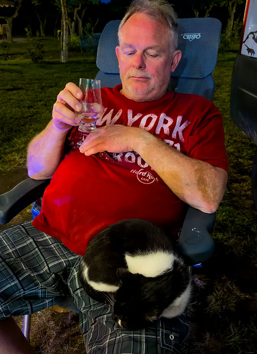 Zurück am Campingplatz ist der Tag noch lange nicht vorbei – zumindest nicht für uns. Während ich ein paar Bilder sortiere, macht Stefan es sich im Campingstuhl gemütlich. Ein Glas Whiskey in der Hand, der Blick irgendwo zwischen „Ich genieße den Moment“ und „gleich schlafe ich ein“. Doch dann geschieht etwas Magisches – oder eher Katzenhaftes.