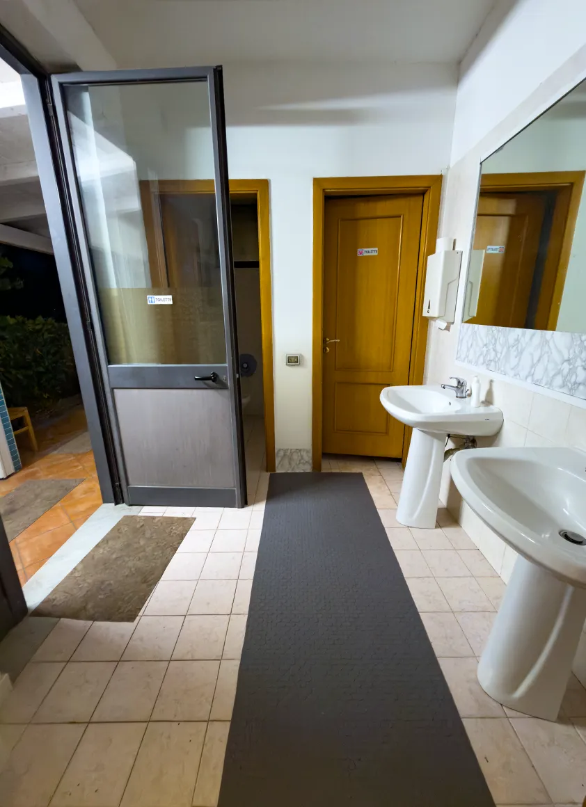 Es gibt ein Familienbadezimmer, sowie barrierefreie Dusch- und WC Räume. Zum abspülen des Geschirrs steh ein Geschirrspülraum zur Verfügung sowie ein Wasch- und Trockenraum für die Wäsche.