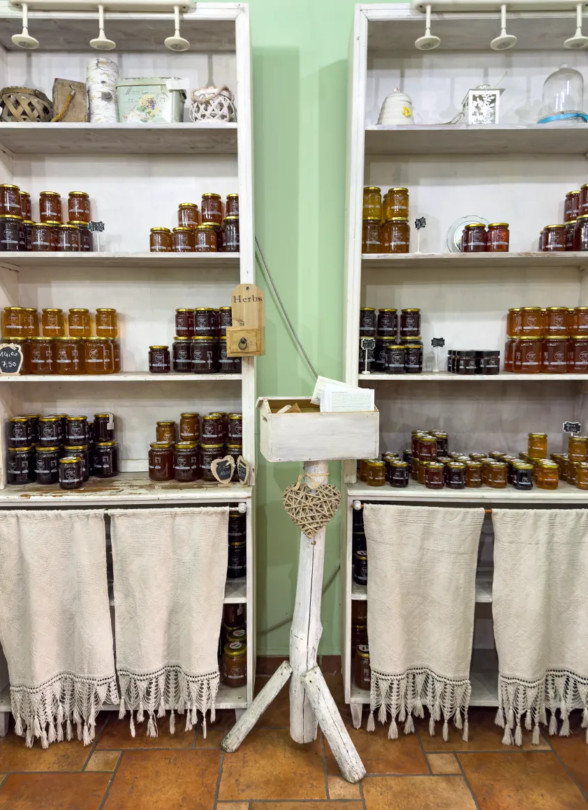 Die Dame lächelt freundlich, als hätte sie nur auf mich gewartet. Sie bittet mich hinein – in einen Laden, der aussieht wie die Requisite einer Märchenszene. Kleine Häuschen, Geschenkverpackungen, Seifen, handbeschriftete Schilder, und natürlich: Honig in allen Varianten.
