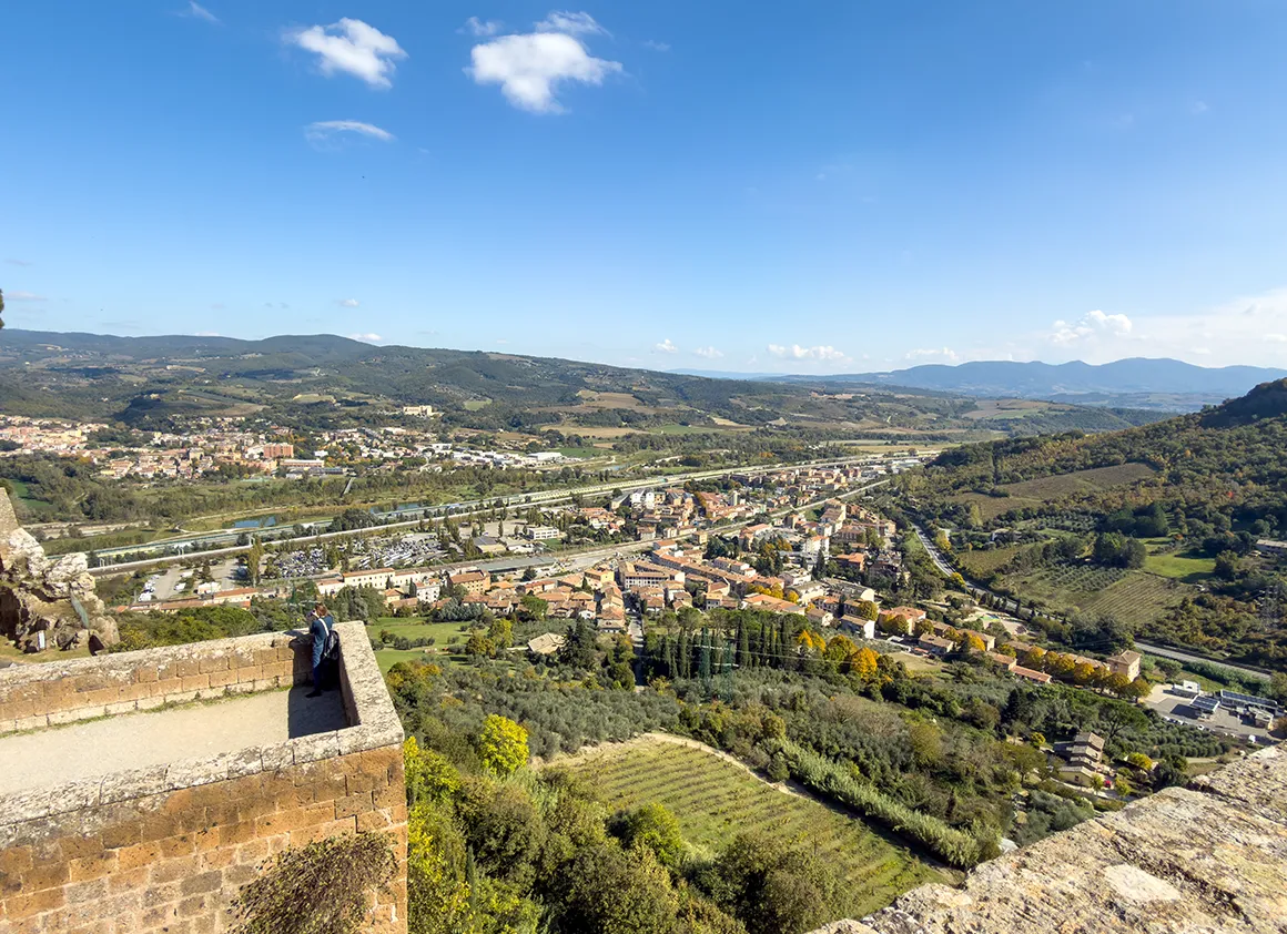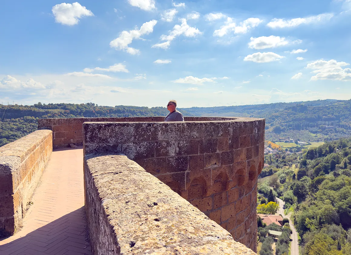 Kaum sind wir aus dem Camper geklettert und einmal um die Ecke gebogen, stehen wir vor der Rocca Albornoz – oder besser gesagt: auf ihr. Diese Festung thront auf dem Tuffsteinfelsen wie eine wuchtige Zeitkapsel aus dem Mittelalter, aber mit der Aussicht einer Drohne. Wir lehnen uns ans Gemäuer, schauen über die Zinnen – und schweigen kurz. Nicht, weil uns die Worte fehlen, sondern weil der Blick einfach alles sagt: sanfte Hügel, grüne Täler, kleine Dörfer, die aussehen wie hingestreute Miniaturen. Und das alles im Licht eines spätsommerlichen Nachmittags, das die Welt wie durch einen Weichzeichner leuchten lässt.