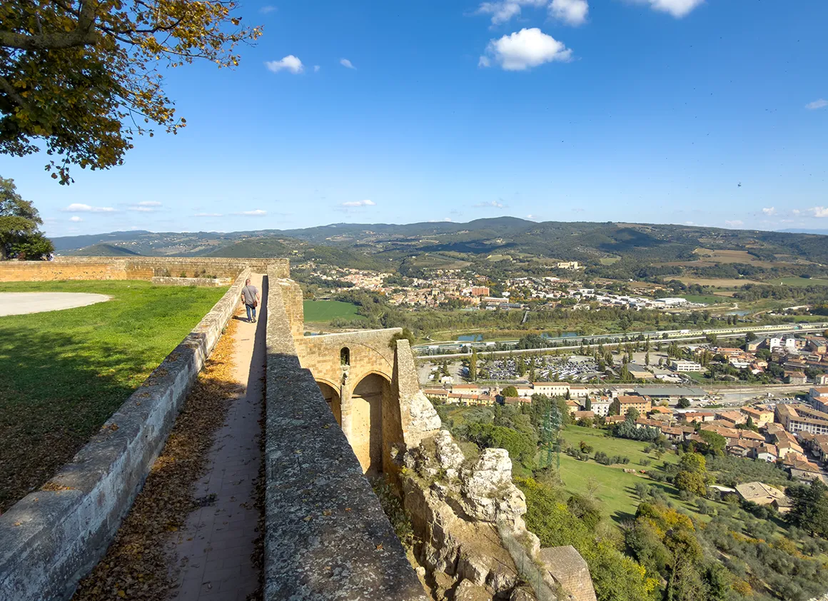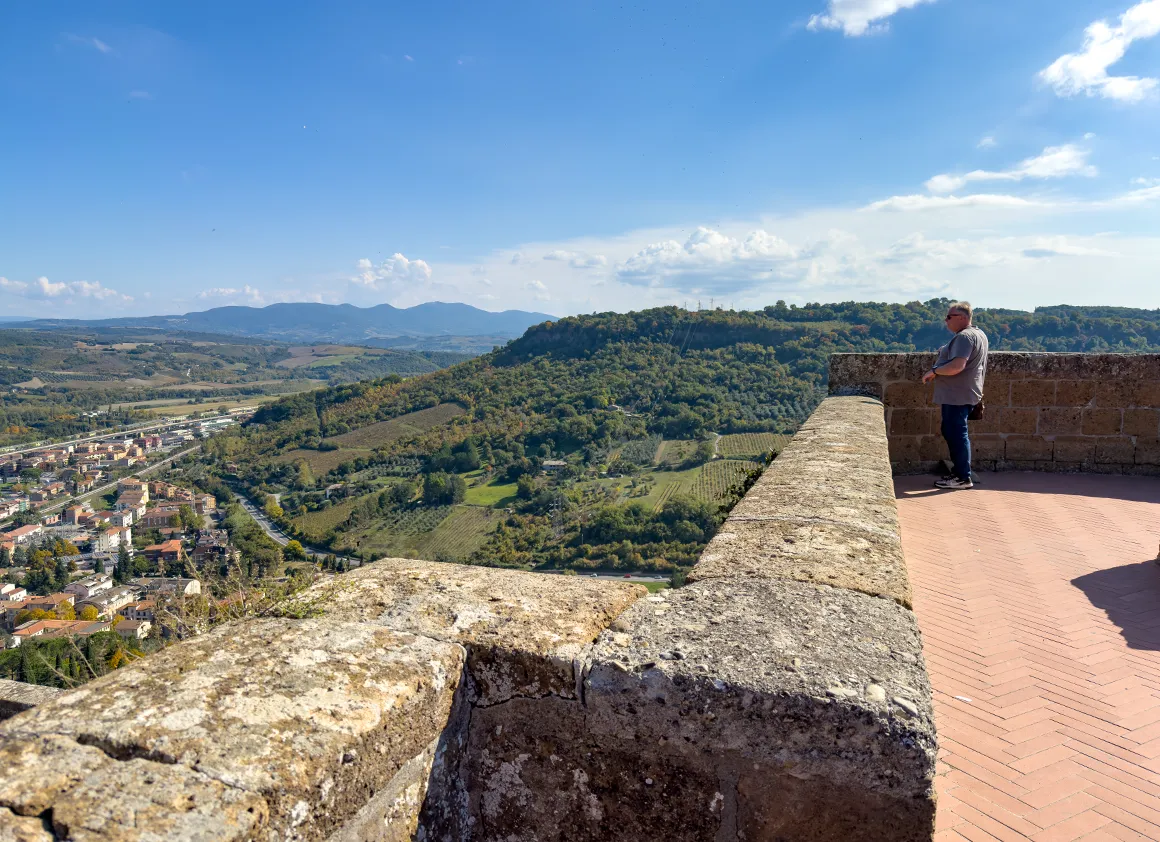 Unten rollen Traktoren durch die Felder, irgendwo bimmelt eine Glocke, und der Duft nach warmer Erde liegt in der Luft. Wir folgen dem befestigten Rundweg entlang der alten Mauern, vorbei an Zypressen, die im Wind rascheln wie altes Pergament. Stefan will wissen, ob hier mal was Belagerungsmäßiges passiert ist. Ich nicke wichtig, tue so, als hätte ich eine Doku gesehen, aber in Wahrheit denke ich nur an die Kamera – und daran, wie gut dieses Licht ist.