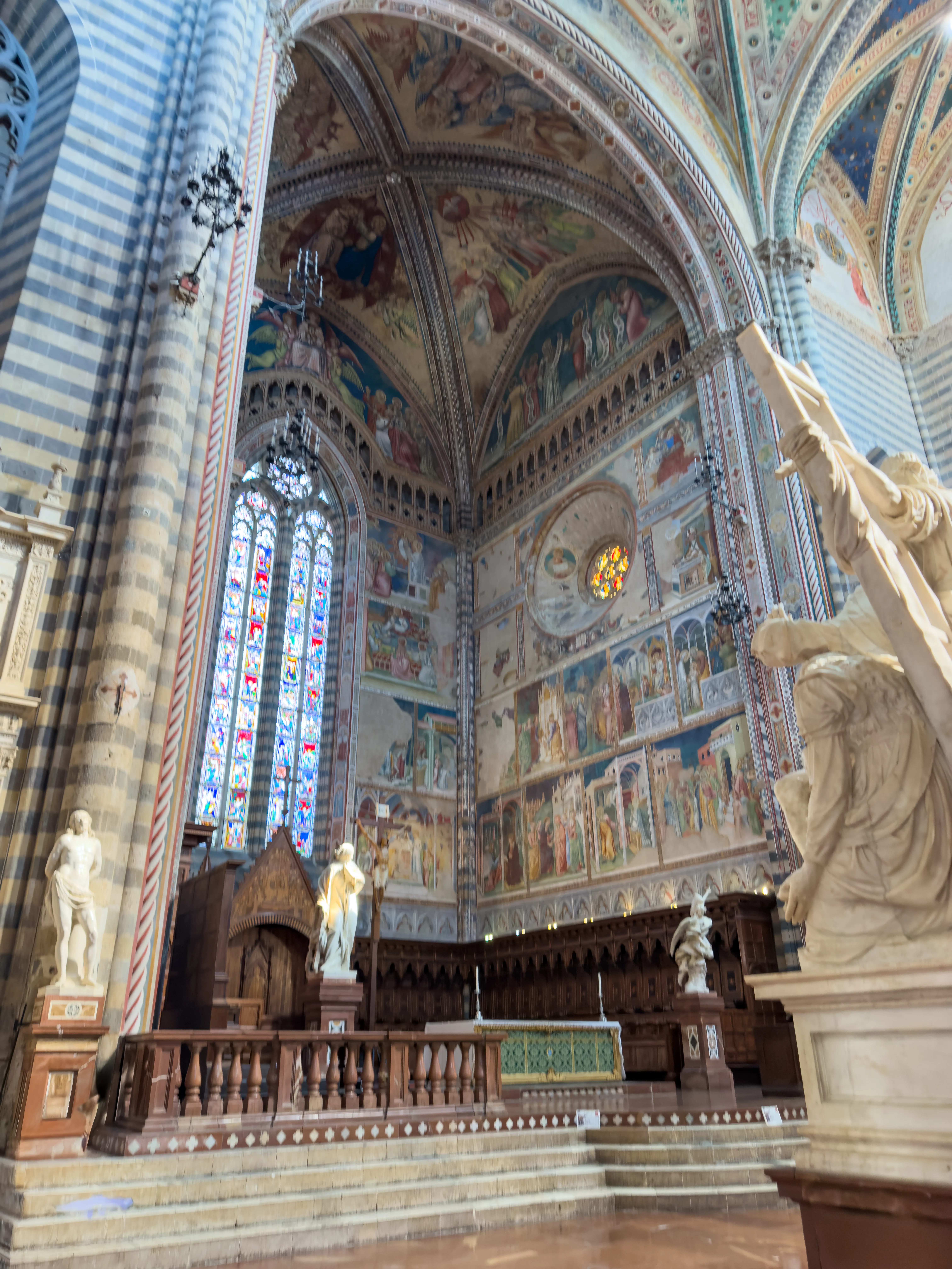 Innen ist die Kathedrale mindestens genauso beeindruckend. Farbgewaltige Fresken, hohe Bögen, das Licht bricht durch die Fenster wie durch Kirchenfenster eben nur in Italien brechen können. Es ist einer dieser Orte, die dich automatisch leiser werden lassen – nicht aus Ehrfurcht, sondern weil die Atmosphäre selbst die Lautstärke runterregelt.