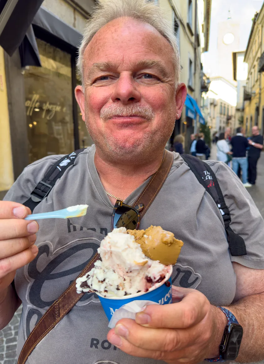 Nach dem kulturellen Overload braucht es dringend: Gelato. Und wie durch göttliche Fügung steht wenige Minuten später ein Eisladen vor uns, dessen Vitrine aussieht wie der Schaukasten zum Paradies. Ich nehme – Überraschung – Nocciola und Pistacchio. Stefan entscheidet sich für Cioccolato und Banana – eine Kombi, die klingt wie ein italienisches Duett aus den Achtzigern, aber erstaunlich gut harmoniert.