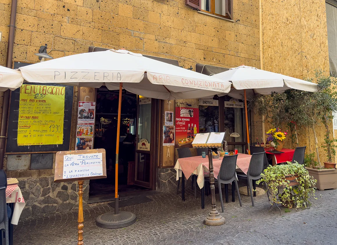 Gleich zu Beginn unseres Spaziergangs durch die Altstadt entdecken wir die Pizzeria Condizionata, deren Außenbereich uns direkt mit rot-weiß-karierten Tischdecken und handgeschriebenen Tagesmenüs anlockt – wie im Bilderbuch. Das „Menù del Giorno“ für 19,90 Euro liest sich wie ein Gedicht in Umbrichelli: Cacio e Pepe, Arrabbiata, Carbonara, Pomodoro – alles dabei, was das Pasta-Herz höherschlagen lässt. Dazu gibt’s ein Hauptgericht: Porchetta Orvietana, diese in Scheiben gemeißelte Poesie aus Kruste, Fett und zartem Fleisch, oder eine saftig gegrillte Salsiccia, begleitet von goldbraunen Ofenkartoffeln oder bunter Caponata. Brot und eine halbe Flasche Wasser inklusive – als ob wir es geplant hätten.