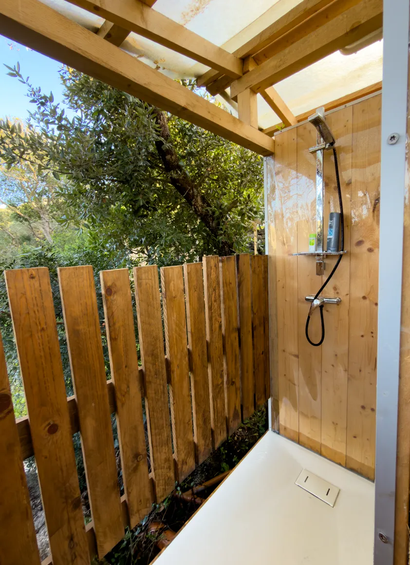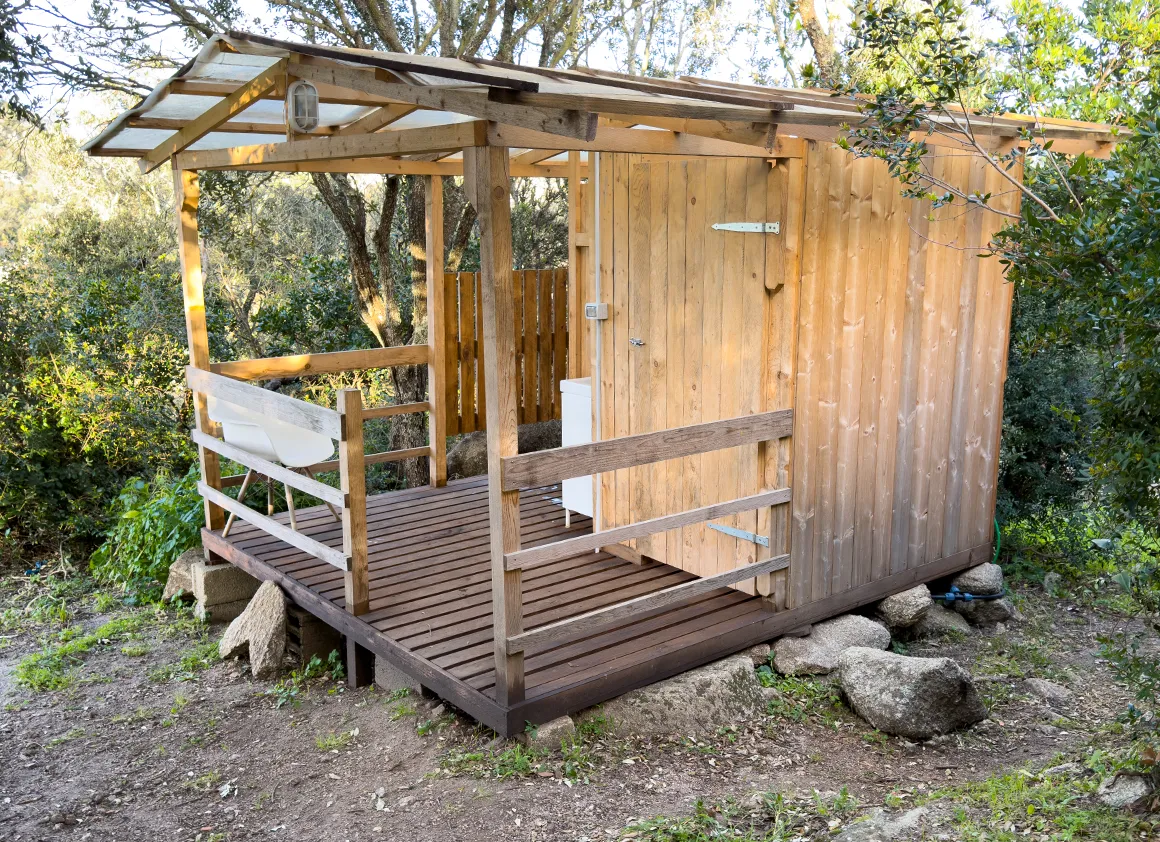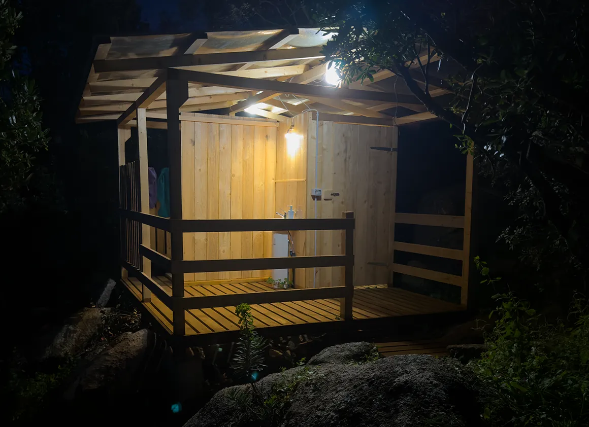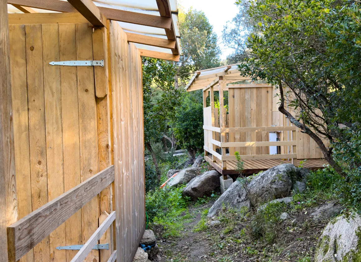 Duschen in Holzhütten – quasi Open-Air mit Sichtschutz. Ein heißer Strahl trifft auf sardische Brise; ein Erlebnis für Hartgesottene. Blitzsauber, urig und definitiv ein Gesprächsthema beim Frühstück.