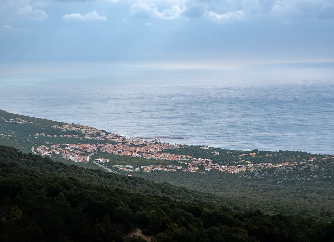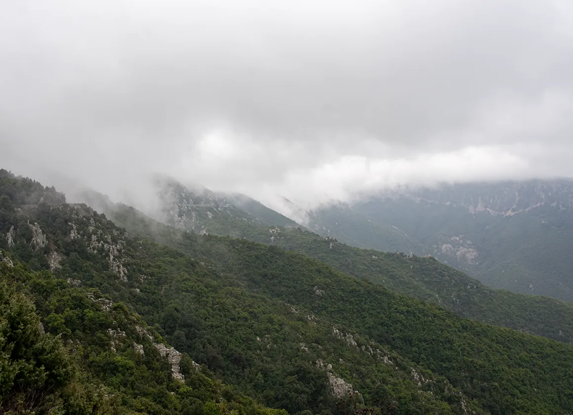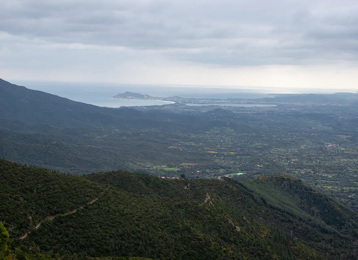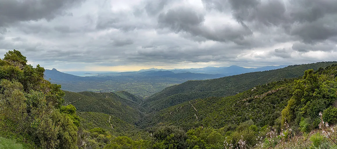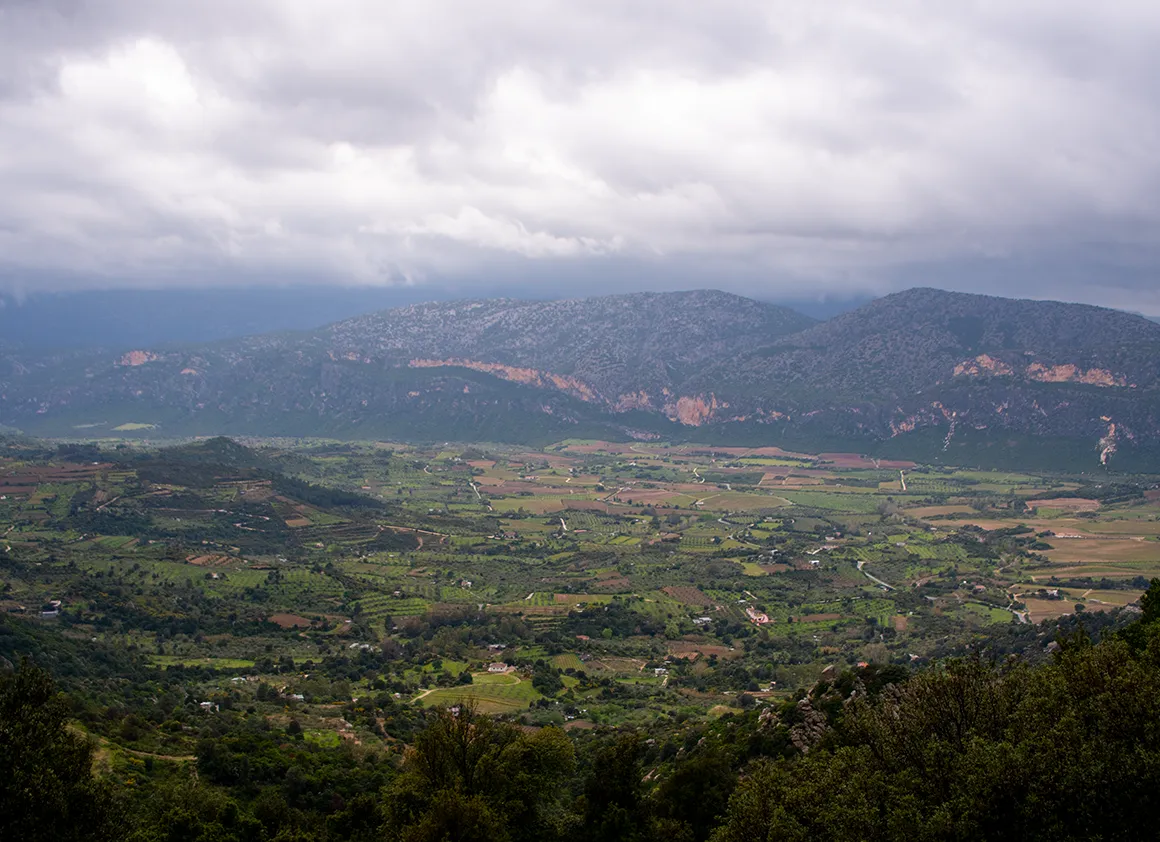 Schon beim Verlassen von Cala Gonone und dem ersten Aufstieg bot sich uns ein Ausblick, der wie eine Mischung aus Mittelmeer-Idylle und aufziehendem Unwetter wirkte. Das Küstenstädtchen lag friedlich unter uns, während sich im Hinterland die Berge bereits in dunkle, schwere Wolken hüllten. Das grüne Tal wirkte wie ein Teppich, der direkt in die schroffen, grauen Felswände der sardischen Bergwelt führt.