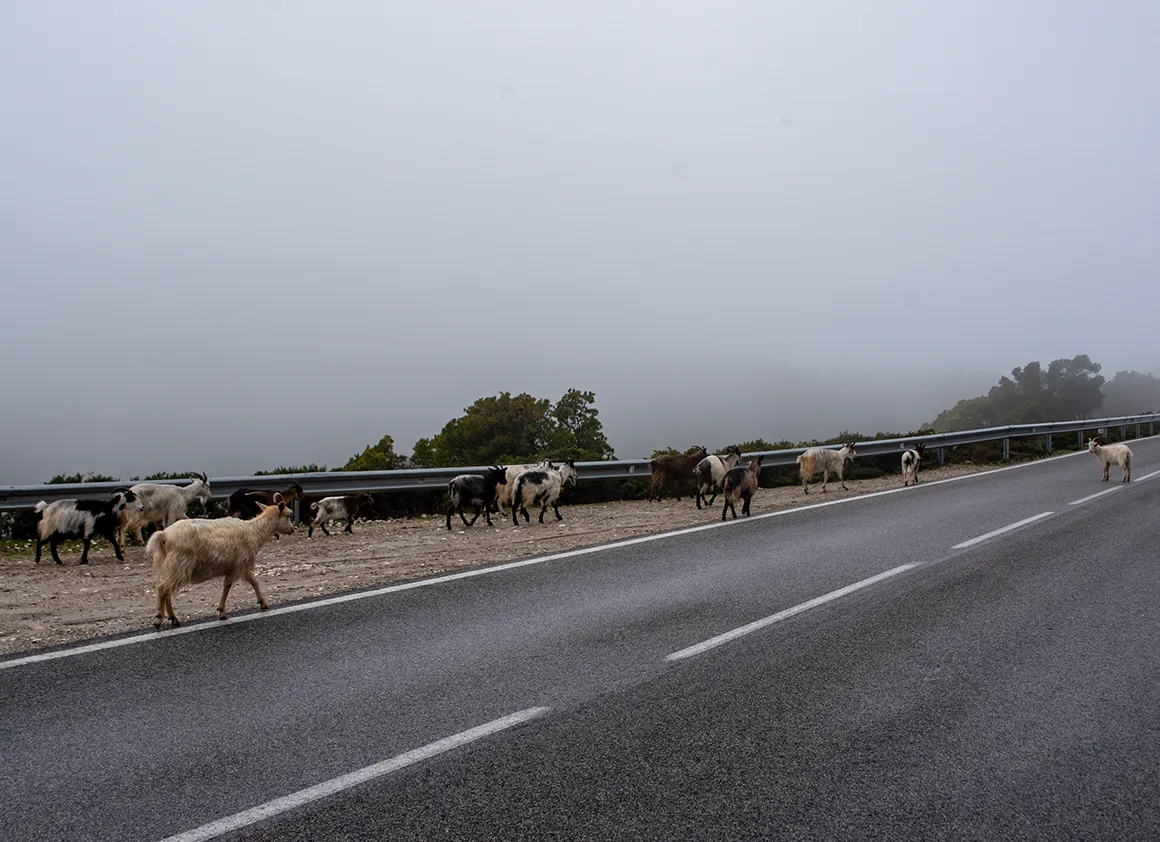 Und dann wurde es richtig kurios: Wer braucht schon eine Safari in Afrika, wenn er die SS 125 hat? Plötzlich hieß es „Bremsen für die Einheimischen“. Zuerst tauchte eine ganze Ziegenherde aus dem Nebel auf, die die Leitplanke als ihre persönliche Laufsteg-Begrenzung nutzte. Völlig unbeeindruckt von unseren 6-Meter-Mobilen spazierten sie am Straßenrand entlang, als gehörten die Serpentinen allein ihnen.
