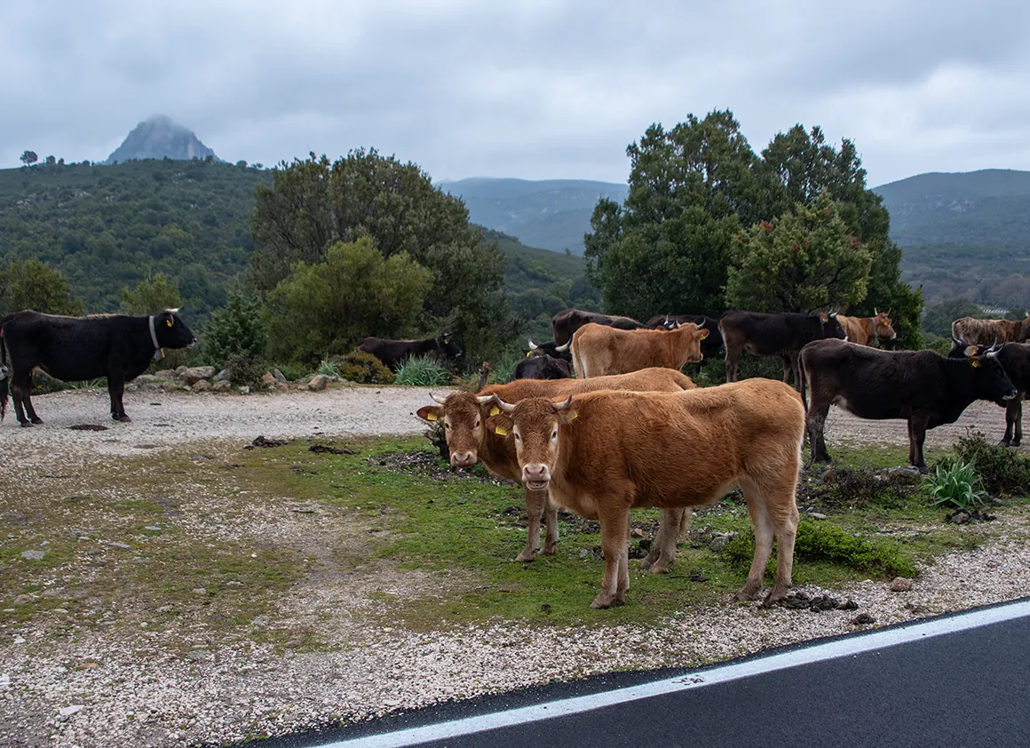 Nur wenige Kurven weiter das nächste tierische Empfangskomitee: Eine Herde Kühe hatte es sich direkt am Asphalt gemütlich gemacht. Zwei der Prachtexemplare starrten uns mit einer Mischung aus Neugier und „Was wollt ihr eigentlich hier?“ direkt in die Kamera. Wir hielten respektvoll Abstand, während die Huftiere die sardische Gelassenheit in Perfektion vorlebten.