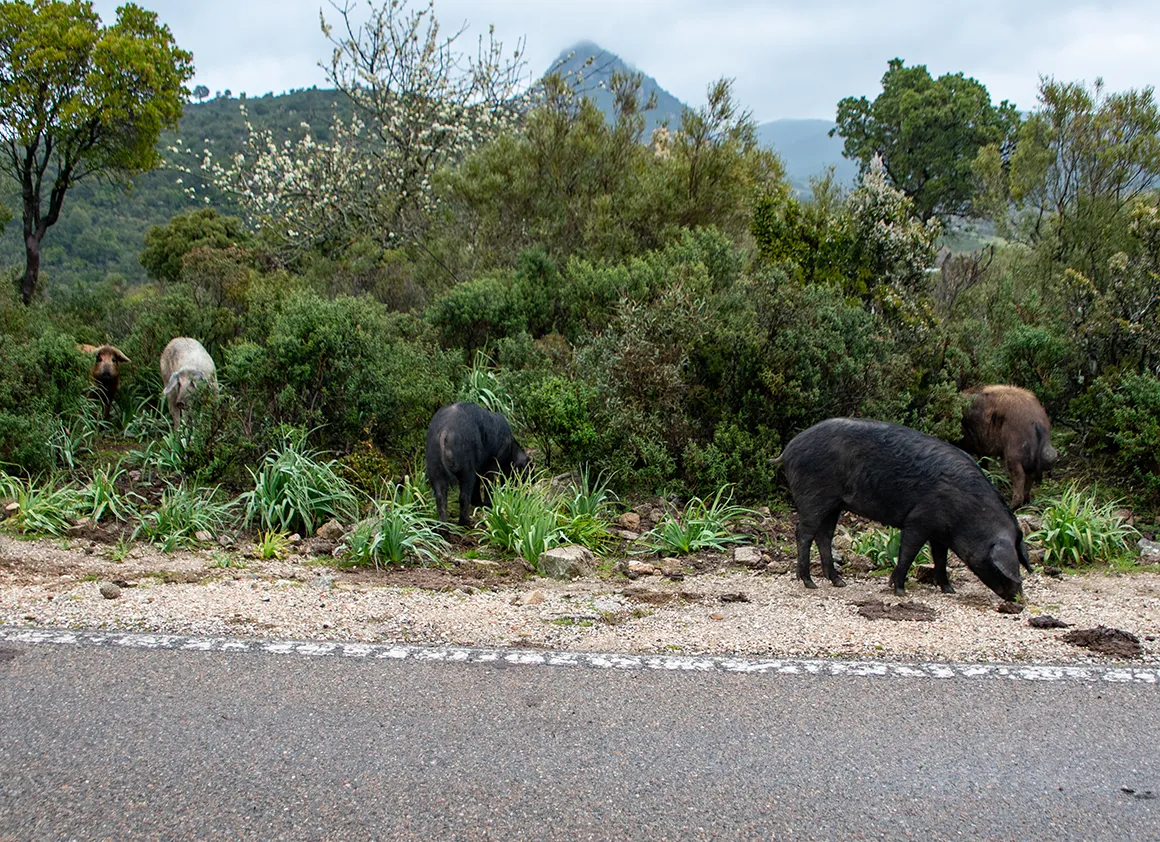 Als wäre das nicht genug, gesellten sich kurz darauf auch noch Schweine dazu. Inmitten von blühenden Sträuchern und saftigem Grün wühlten sie völlig tiefentspannt direkt neben der Fahrbahn nach Leckereien. Noah und Emilia klebten an den Scheiben – so nah kommt man der sardischen Fauna selten, ohne das Fahrzeug zu verlassen.