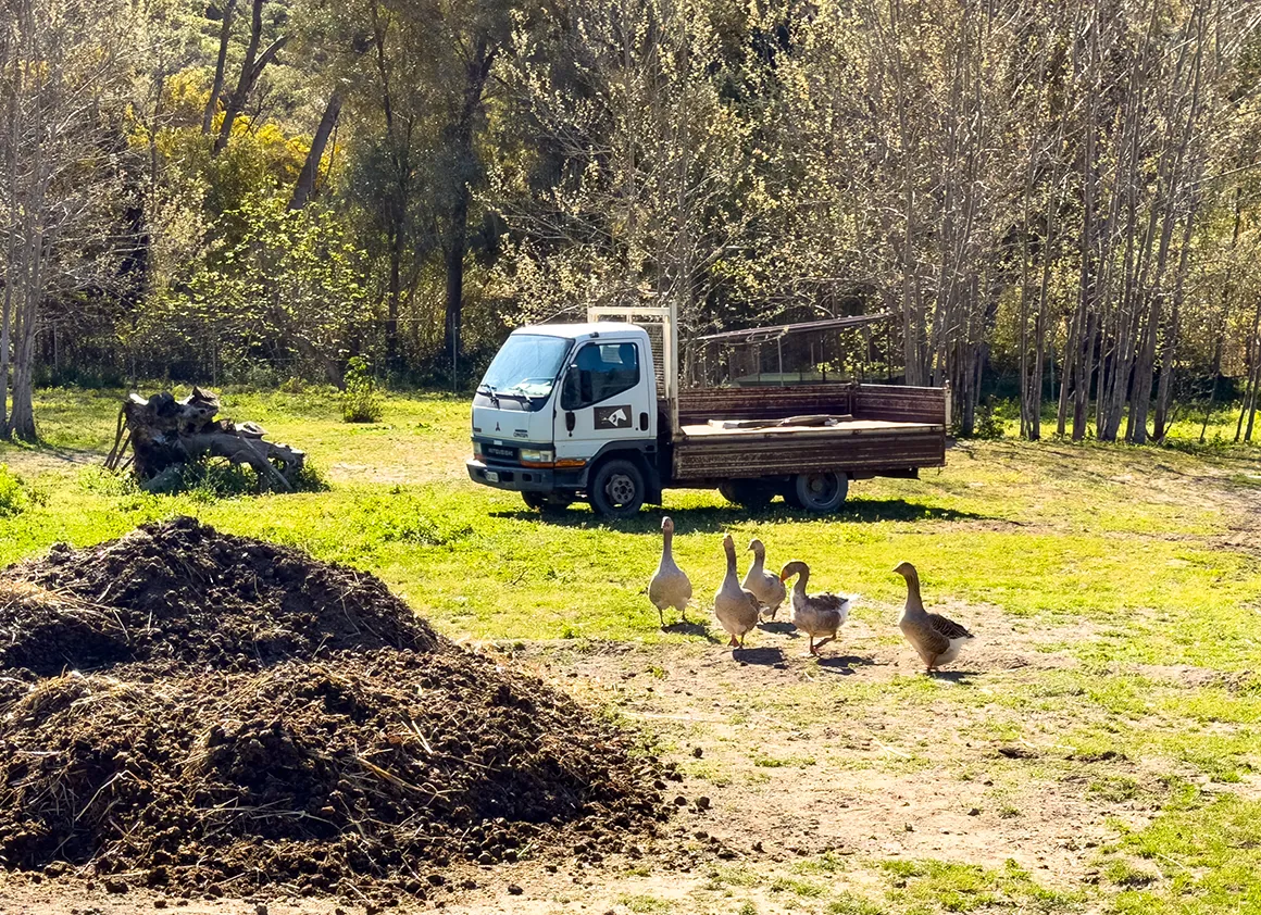 Vergesst alles, was ihr über sterile Parzellen, akkurat gestutzte Hecken und asphaltierte Wege wisst – bei Giuseppe und Andrea auf Coru e Bentu (Sardisch: Coru = Herz, Bentu = Wind) in Fluminimaggiore taucht ihr direkt in das sardische Original ein. Hier parkt man den Camper nicht einfach nur, man zieht quasi bei der Familie ein. Und die Familie ist groß: Wir standen mit unseren 6-Meter-Schiffen mitten auf der saftigen Wiese, in direkter Nachbarschaft zu einer bunt gewürfelten WG aus Hühnern, Enten, Gänsen, Katzen, Hunden und – kein Witz – echten Mustangs. Wer hier morgens die Tür öffnet, braucht keinen Wecker; man wird vom Wiehern und Gackern begrüßt.